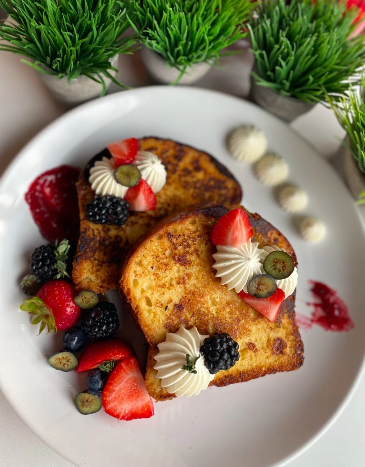 Pain Perdu (French toast) served with whipped cream, berries and maple syrup $15.50